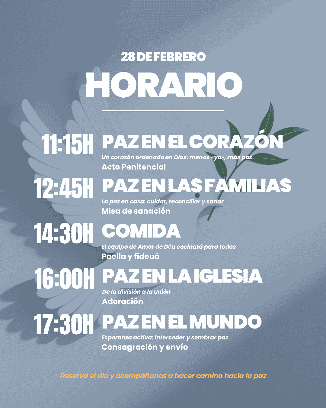 La asociación Amor de Déu celebrará el sábado 28 de febrero de 2026, de 10:30 a 19:00, una Jornada por la Paz en Vil·la Gospa (c/ Alzines, 9, Sant Vicenç de Montalt, Barcelona). La iniciativa propone un día completo de oración e intercesión “por la paz”, con espacios de reflexión, rosario, acto penitencial, adoración y momentos comunitarios.