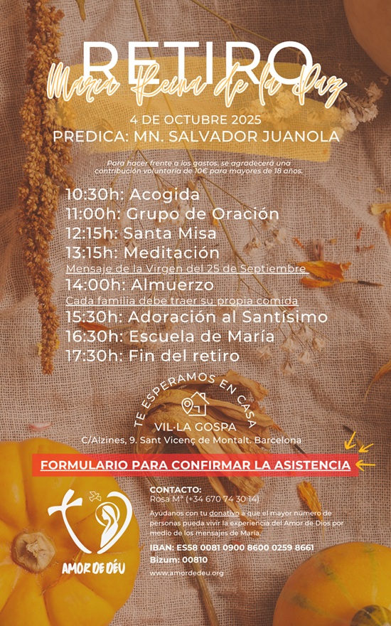 Amor de Déu organiza un Retiro el sábado día 4 de octubre de 2025 en Vil·la Gospa, a 35 minutos de Barcelona.