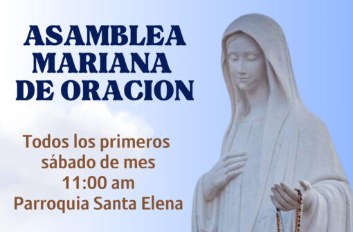 Todos los primeros sábados de mes te invitamos a la Asamblea Mariana de Oración, donde vivimos la experiencia de Medjugorje a través del sacramento de la reconciliación, el rezo del rosario, Adoración Eucarística y la santa Misa. Nos reunimos cada primer sábado de mes en la parroquia Santa Elena, a las 11 de la mañana.