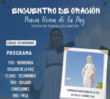 Los esperamos el sábado 1 de noviembre a partir de las 17.00 horas en la parroquia María Reina de la Paz (Bvar. José Batlle y Ordóñez 2645 -ex Propios- esq. Turene) para seguir perseverando junto a nuestra Madre.