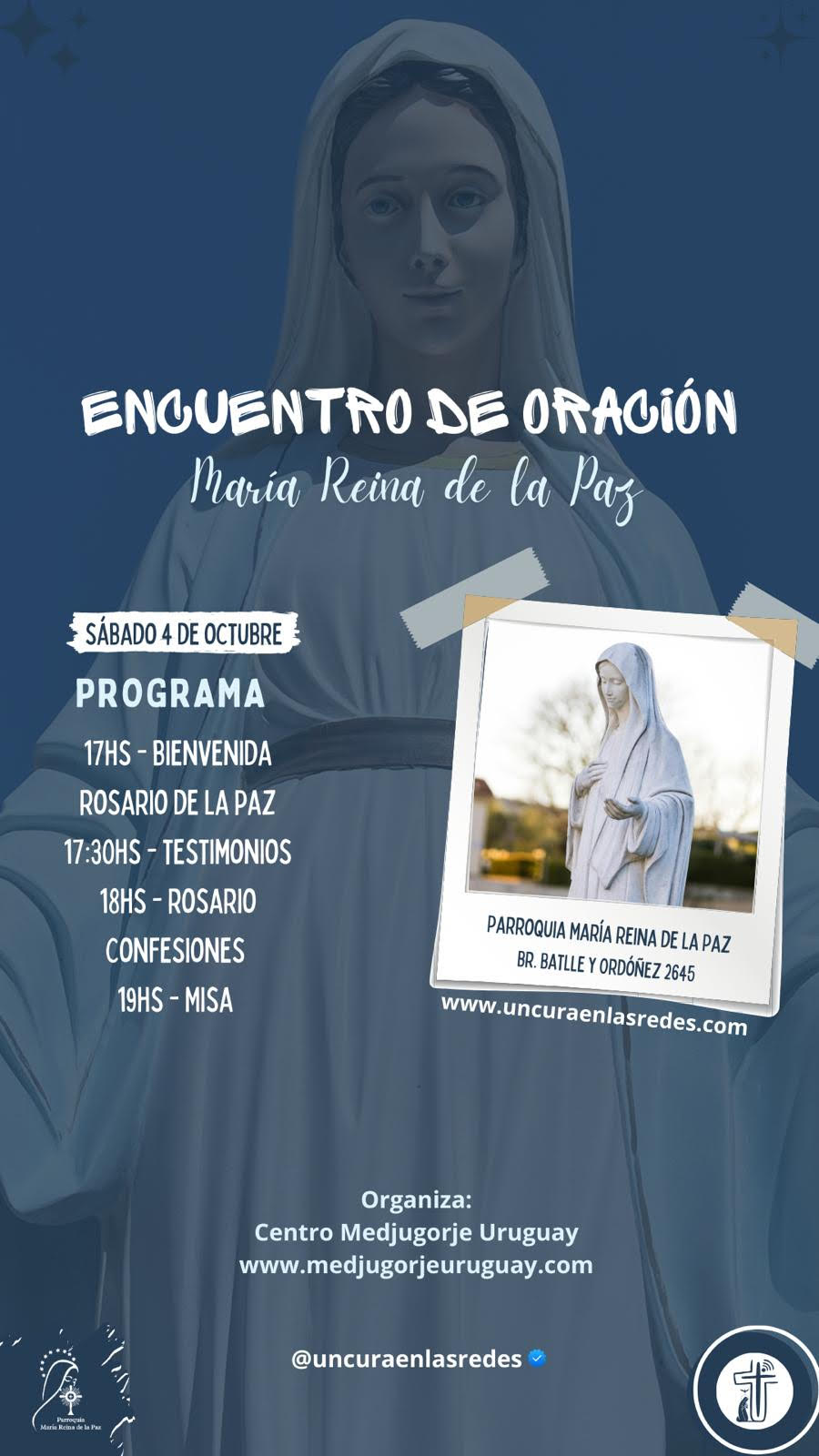 Los esperamos el próximo sábado 4 de octubre a partir de las 17hs en la Parroquia María Reina de la Paz (Bvar. José Batlle y Ordóñez 2645 -ex Propios- esq. Turene) para seguir perseverando junto a nuestra Madre.