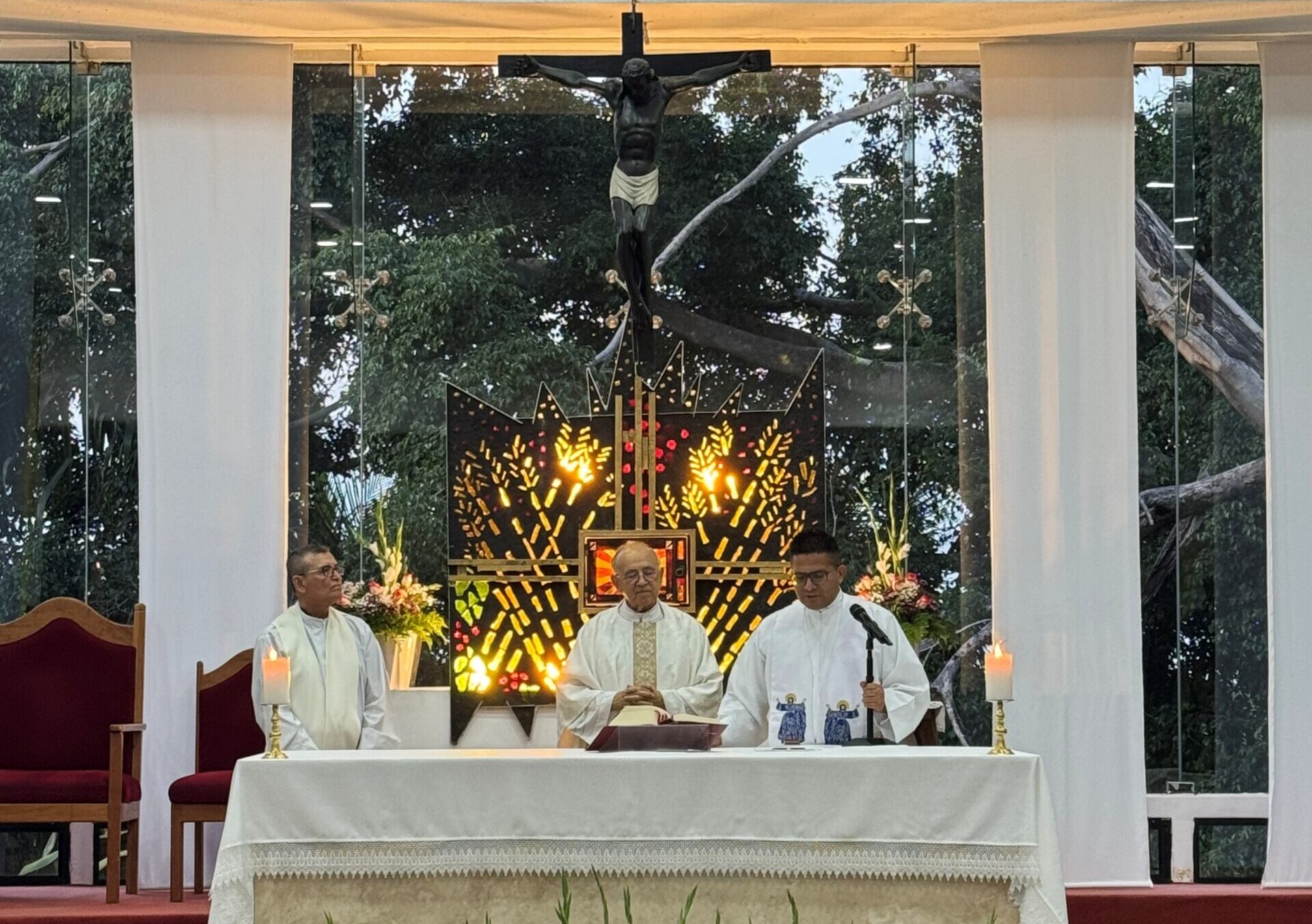 El jueves 16 de abril de 2026, en la Parroquia Santa Elena, se celebró la Eucaristía —correspondiente al tercer jueves del mes— presidida por el P. Inocencio Llamas y concelebrada por el P. Nelson Díaz. La jornada, que tuvo lugar de 18:00 a 20:00 horas y fue transmitida por Lumen El Salvador, estuvo centrada en un fuerte llamado a la conversión.