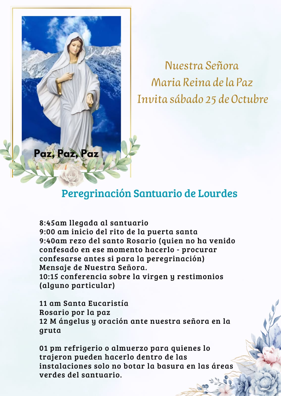 El próximo sábado 25 de octubre, y organizado por el grupo de Nuestra Señora María Reina de la Paz, se realizará una peregrinación al Santuario de Lourdes, en Nicaragua. En el encuentro se impartirá el sacramento de la reconciliación, se rezará el santo Rosario, se celebrará la Eucaristía, se hablará del ultimo mensaje de la Virgen y habrá también testimonios. La jornada culminará con un almuerzo compartido.