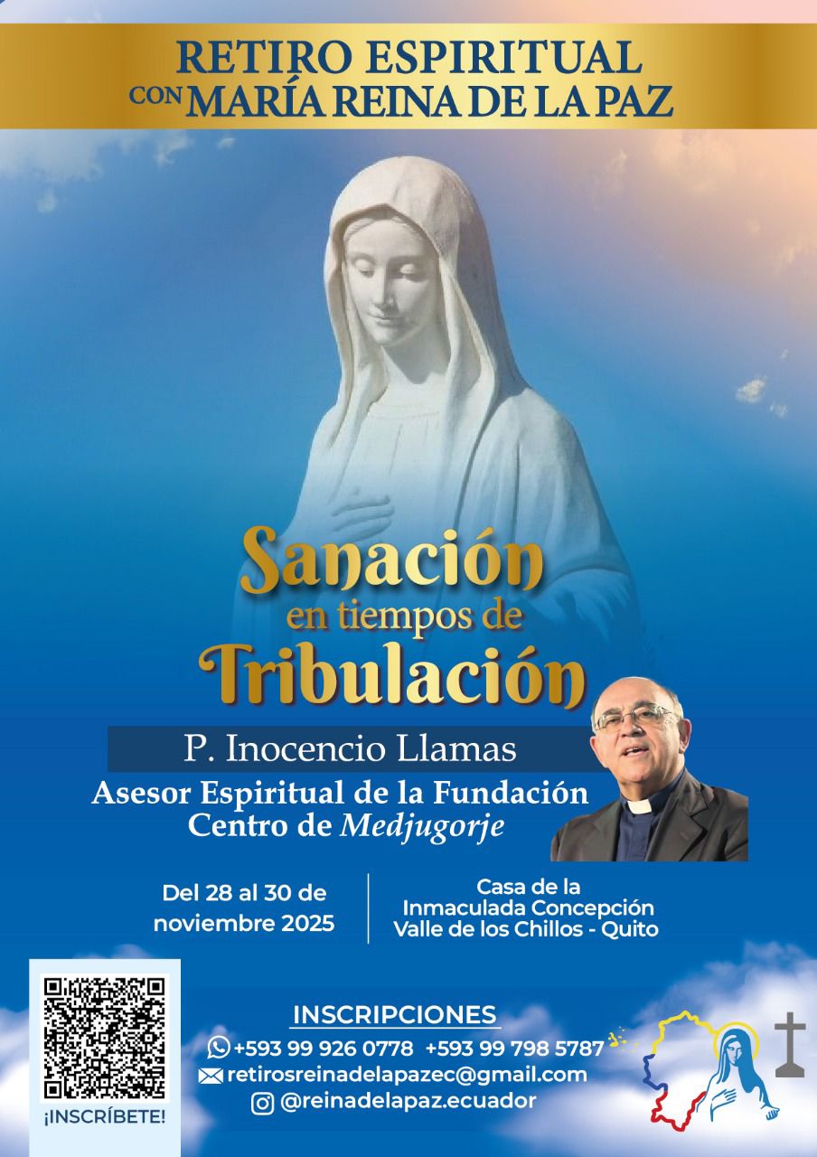 Dará un retiro espiritual que se ha llamado “Sanación en tiempos de Tribulación”. Aprovechemos esta ocasión para renovar nuestra fe, sanar el corazón y acercarnos a Dios de la mano de María, la Reina de la Paz.