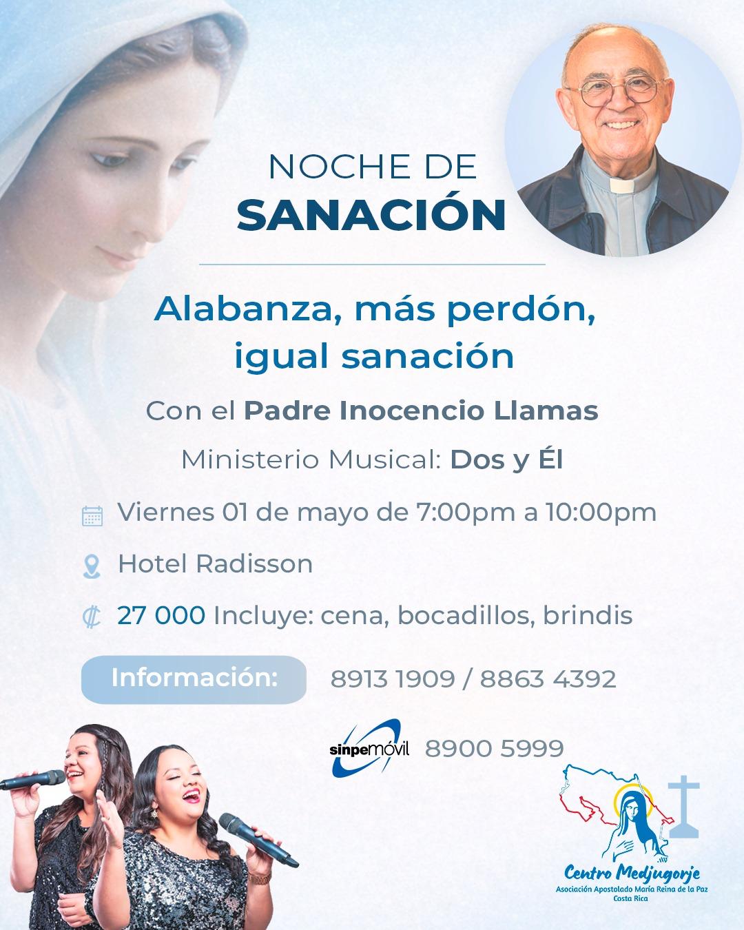 La Asociación Apostolado María Reina de la Paz – Centro Medjugorje Costa Rica invita a participar en dos encuentros especiales de sanación y oración que se realizarán a inicios de mayo en San José, con la presencia del P. Inocencio Llamas.