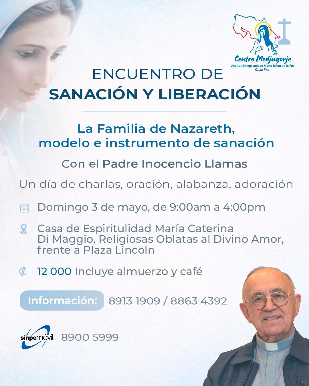 Por su parte, el domingo 3 de mayo se llevará a cabo el “Encuentro de Sanación y Liberación”, desde las 9:00 a.m. hasta las 4:00 p.m., en la Casa de Espiritualidad María Caterina Di Maggio, de las Religiosas Oblatas al Divino Amor, frente a Plaza Lincoln. Este segundo encuentro propone un día completo de charlas, oración, alabanza y adoración, con el tema “La Familia de Nazareth, modelo e instrumento de sanación”. El aporte para participar es de 12 000 colones, incluyendo almuerzo y café.