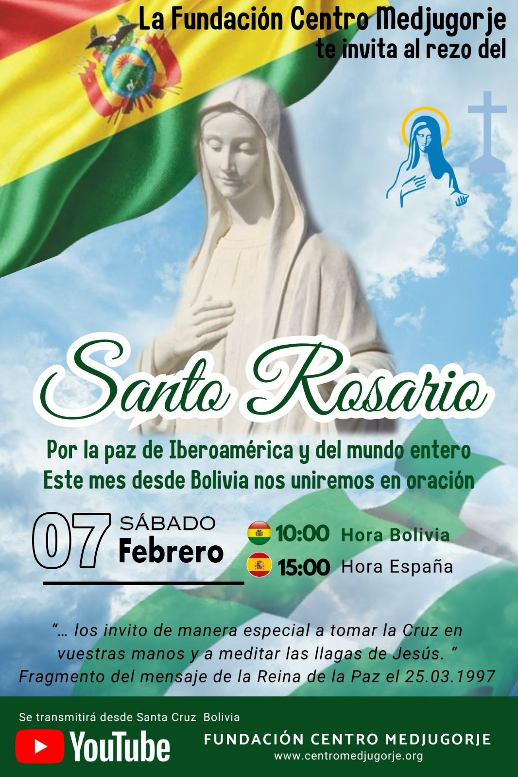 Esta iniciativa nace en respuesta al insistente llamado a orar por la paz que nos hace nuestra Madre, la Reina de la Paz. En el mes de enero, el próximo sábado 7, con la transmisión en directo desde Bolivia, a las 10.00 de la mañana, hora local.
